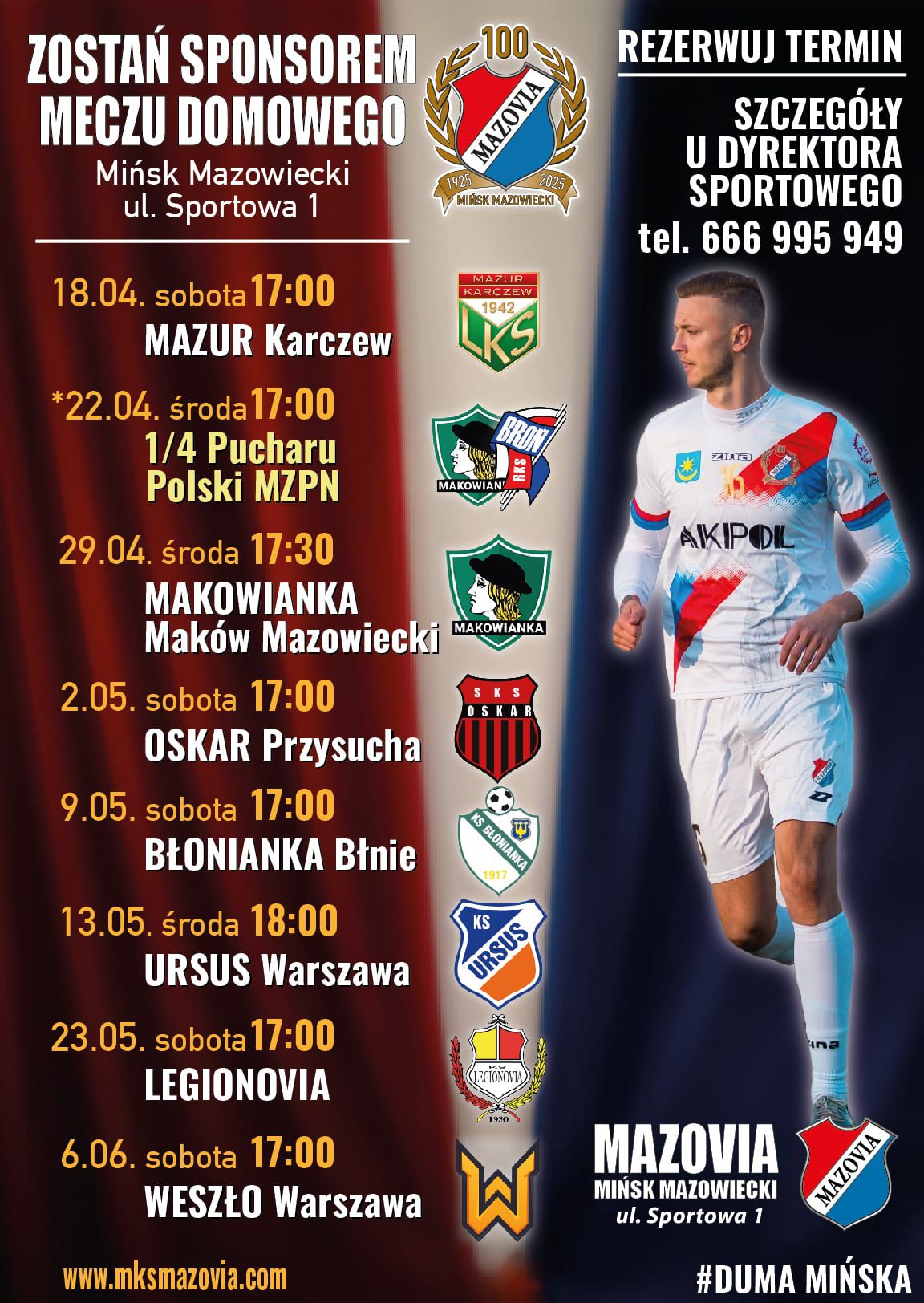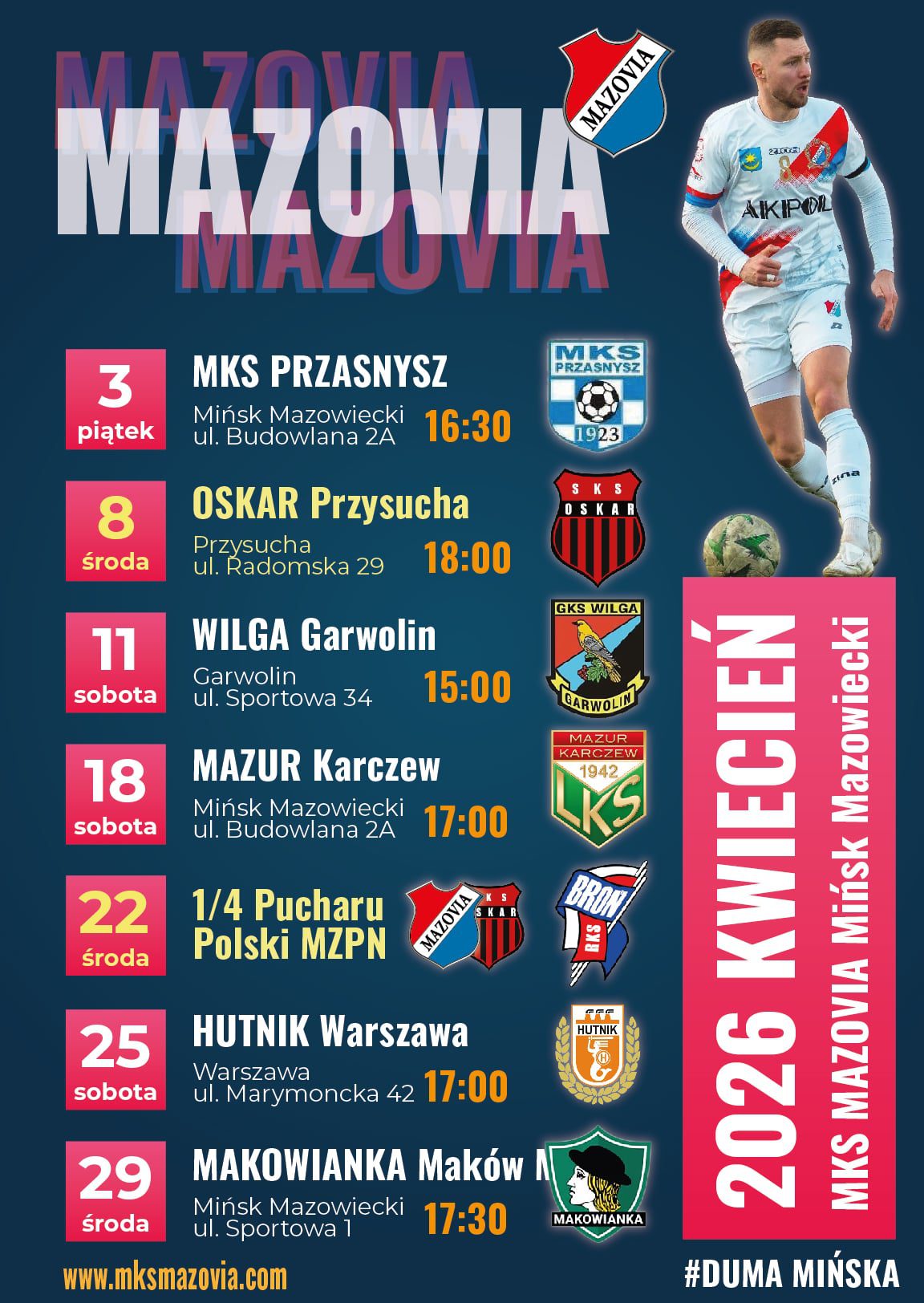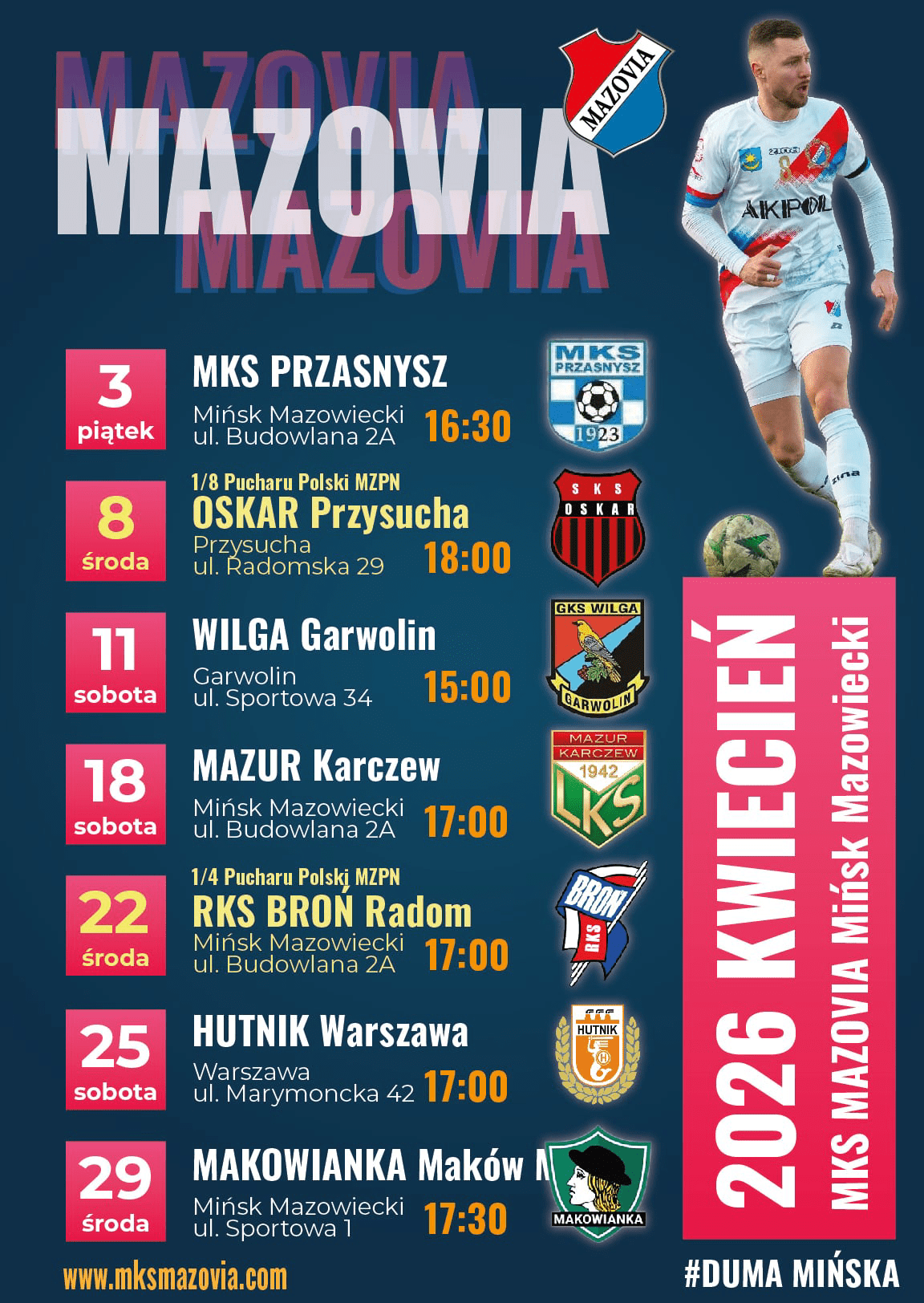 Sobota 18.04.2026 godz. 17:00 Stadion MOSiR, ul.Budowlana 2A, Mińsk Maz.